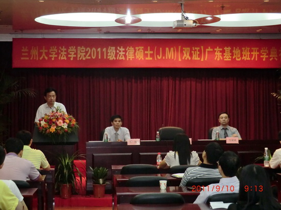 2011年9月10日上午,兰州大学2011级法律硕士研究生广东班开学典礼在中科院广州分院大院内顺利举行。出席本次典礼的领导有兰州大学法学院党委倪舒平书记,兰州大学法学院副院长刘斌斌教授。开学典礼由兰州大学法学院研究生广东教育基地主任李柏主持。